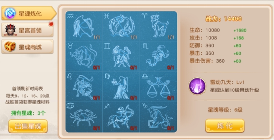 十二星宫共有十二个星座,每个星座都有对应星魂,当玩家集齐所有星座的星魂时就可以消耗掉十二星魂进行一次炼化,每炼化一次星魂等级会提高一级,获得大量属性加成,当星魂等级达到5级,还可以解锁雷动九天技能。