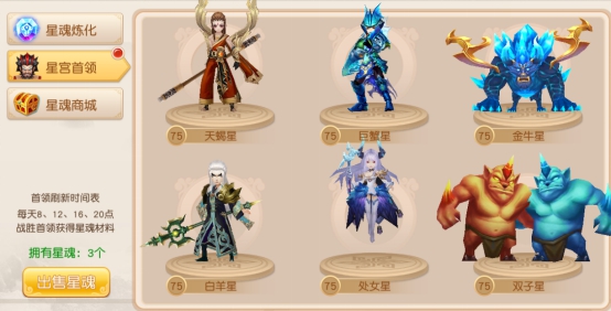 玩家可以通过挑战星宫首领获得丰厚奖励,更有机会掉落星魂,星座首领会在不同的时间段刷新一次。