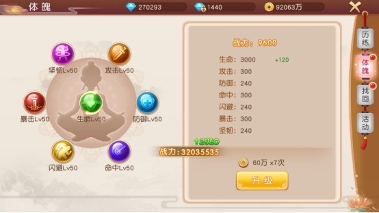 使用铜钱进行升级体魄,每升10次等级铜钱会随之递增,战力也会随之增幅。