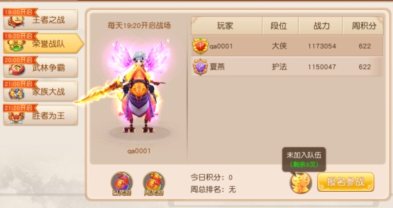 每天19:20-19:35开启,玩家≥50级即可参加,跨服随机3V3对战,玩家可以组队参加。可以获得炫宠碎片,荣誉,宝石等等奖励。