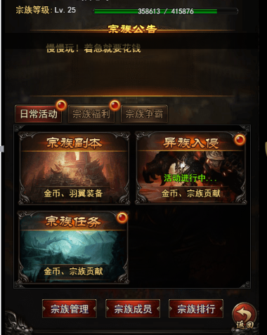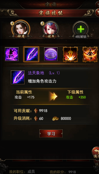 加入宗族之后完成任务或者打败异族入侵可以获得贡献,这些贡献则是用来升级宗族技能的,一共有五个技能可以学习,当然我们并不能像角色就能那样直接用金币升到满级,因为声望跟不上啊,所以选择个主要的进行学习就好啦。