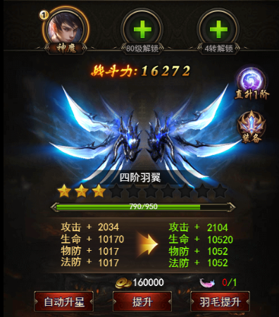 激活翅膀的时候使用金币升级是4W一次,接下来是8W、12W、16W以此类推,对土豪来讲的话,到五级、六级之前都是可以用金币来升级的,也就是16W一次的时候,只要你挑战副本的关卡打的足够高,然后把羽毛积攒下来之后再开始升级。普通玩家的话可以考虑4级之后再来是使用羽毛升级。