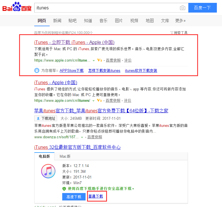 1) 在百度搜索“itunes”,进入苹果官网下载或者点击下方百度软件中心推荐的普通下载;