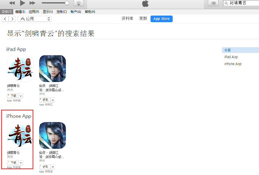 2) 安装完成后进入appstore,搜索“剑啸青云”;