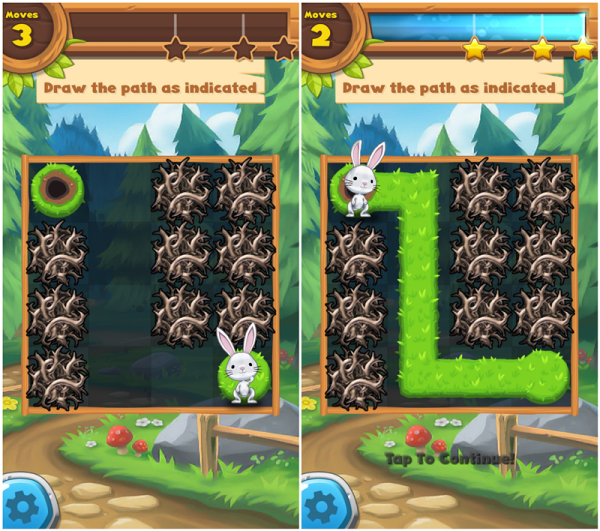 接下来,就是为小动物铺一条顺利的回家的路:用手指在闲置的方块上划线指路,以小动物为起点,以树洞为终点,小动物就会跟着你画的路线蹦蹦跳跳地回家啦。