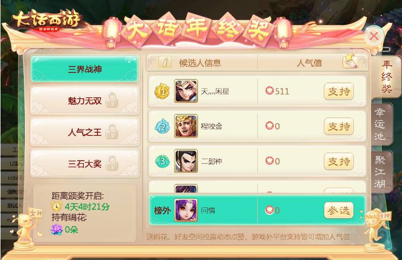 英侠齐聚,共逐人气年终大奖!活动期间,将会出现一个人气榜单记录玩家的人气,玩家可通过活跃度获得绢花来赠送给自己喜爱的候选人,或是通过“参选”任务自己参与人气竞选!人气榜单将每隔一定天数开启奖项的评选投票,获得支持点最多的玩家将荣膺该奖项冠军。届时,名列三甲的人气玩家不仅能获得专属限定称谓奖励,还将收获精美的实物奖励!