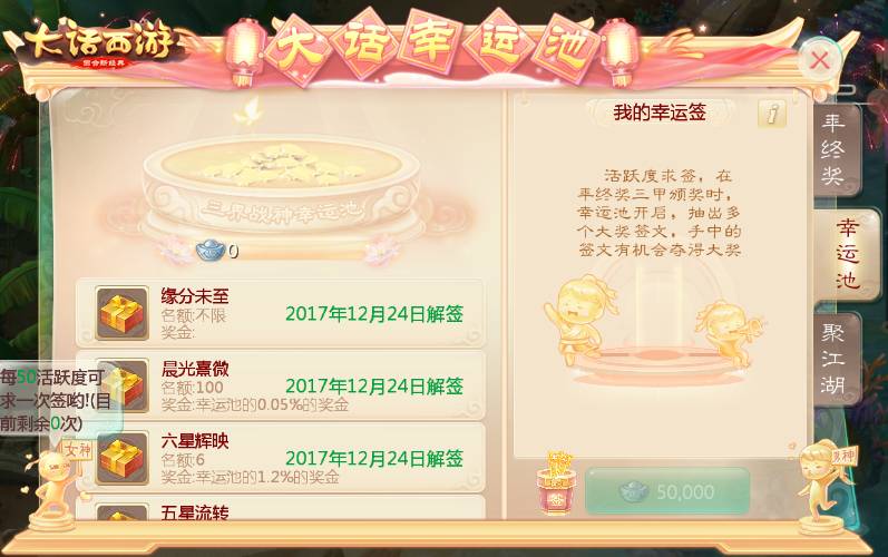 年终狂欢,更是粉丝的狂欢,在人气榜单活动进行的同时,还有幸运池为玩家送上惊喜大奖!玩家可通过活跃度来获得为幸运池投币的机会,除了能增加幸运池的奖池上限之外,玩家还将随机获得一张抽奖符文,可在年终奖颁奖之日抽取惊喜豪华大奖,赢取海量银两!